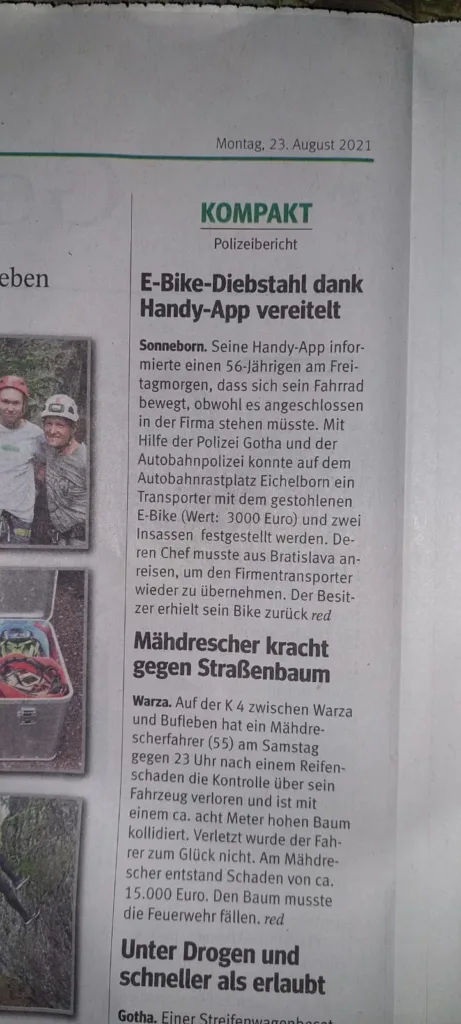 Il GPS PAJ mi ha aiutato a recuperare la mia amata eBike dopo che era stata rubata con grande audacia all’interno dell’area aziendale. Sono rimasto costantemente in contatto telefonico con la polizia autostradale, poiché potevo seguire il percorso in tempo reale grazie al tracciamento live. Tra la notifica di allarme sul mio telefono e l’arresto dei ladri in un’area di servizio autostradale sono passate solo due ore.