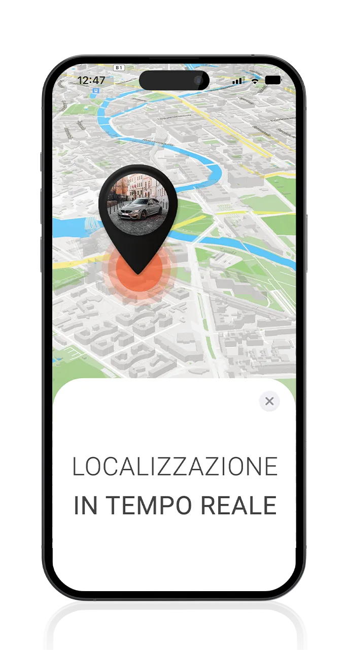 Schermata app FINDER con localizzazione in tempo reale di auto con localizzatore GPS